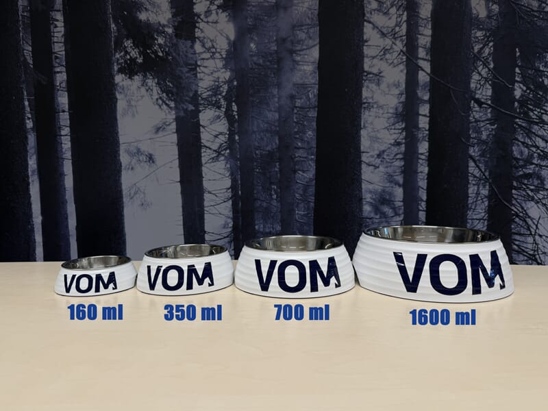 Hvit Dogman matskål med blå VOM logo som kommer i 4 forskjellige størrelser: